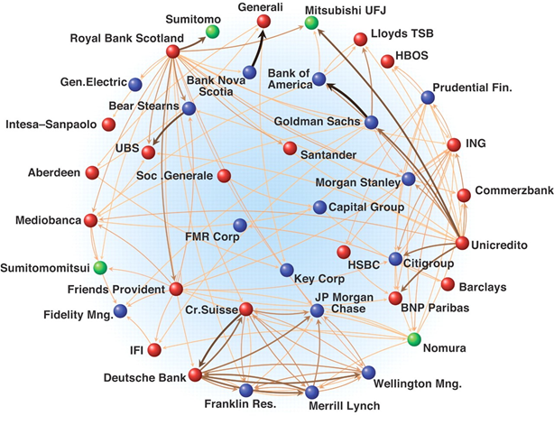 金融体系是以个体间相互作用形成的网络为基础的另一类复杂系统。图中的圆点是金融机构,连线是金融机构间的关系,比如债权债务关系或者持股关系。事实证明这一网络中连接的数量和连接方式等结构特征决定了整个网络的稳定性。