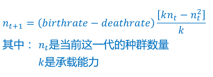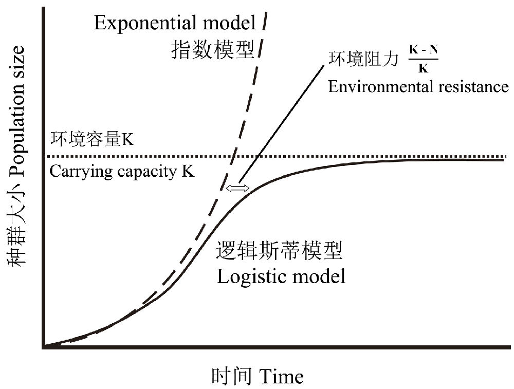 任何一个物种都有使其种群无限增长的内在潜力(即所谓指数增长),这是生命设计的基本原理,失去这种特性的物种其命运就是灭绝。而环境的有限性将阻止这种趋势的无限发展,使其趋于一个平衡值K(即所谓的环境容量),种群大小N越接近K,环境阻力越大。