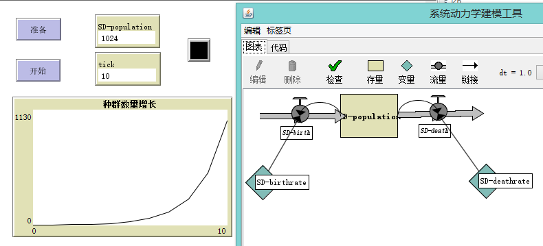 我们可以在NetLogo的【工具】→ 【系统动力学建模工具】中构建简单的系统动力学模型。