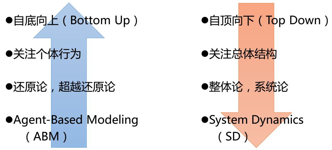 复杂系统的分析与建模,有两种不同的视角,即自顶向下(Top Down)和自底向上(Bottom Up)。而这就涉及到还原论、整体论等哲学概念,以及系统论、超越还原论等系统科学概念。