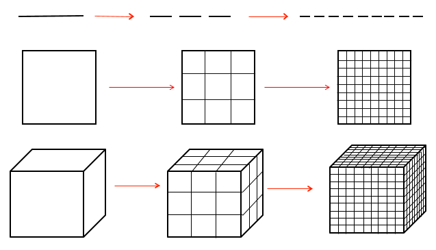 2维:N = 4, M = 2, d = log 4 / log 2 = 2 (二等分)