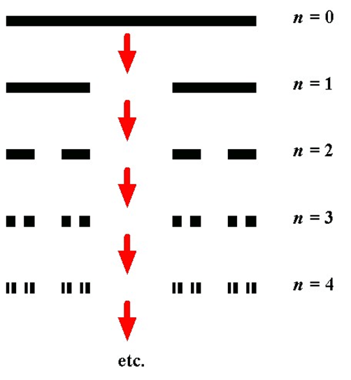 取一条长度为L的直线段,将它三等分,去掉中间一段,留剩下两段,再将剩下的两段再分别三等分,各去掉中间一段,剩下更短的四段,……,将这样的操作一直继续下去,直至无穷,由于在不断分割舍弃过程中,所形成的线段数目越来越多,长度越来越小,在极限的情况下,得到一个离散的点集,称为康托尔点集,记为P。