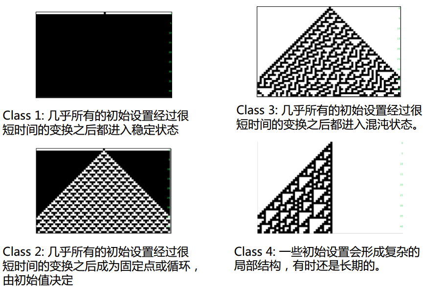 Wolfram对CA进行了非常深入的研究,尤其是这256种ECA模型一一进行了详细而深入的研究。我们上一节提到的ECA的规则标号其实就是Wolfarm发明的。他研究表明,尽管初等元胞自动机是如此简单,但它们表现出各种各样的高度复杂的空间形态。经过一定时间,有些元胞自动机生成一种稳定状态,或静止,或产生周期性结构,有些产生自组织、自相似的分形结构,据此Wolfram将其分为四种类型:单一、周期、混沌、复杂。