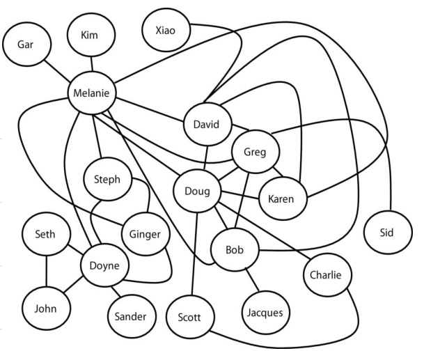 我们参考书的作者M. Mitchell把她的社会关系按照网络的规则画了出来,里面的节点是人,如果两人认识,则认为两人之间有连结。
