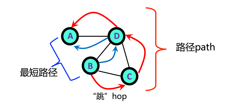 网络(图)是抽象的,连结(边)的长度没有实际意义,一条边的长度就是一“跳”(hop),路径上有几条边,长度就是几跳。