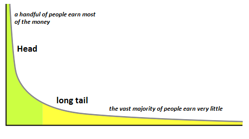 对应的两种分布就是Zipf分布和Pareto分布,两者的区别是前者为离散分布后者为连续分布。两者都是显示出明显的“长尾”形态,而“长尾”分布则属于幂律分布(Power-law Distribution)。