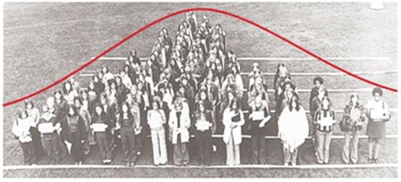 自然界与社会生活中,群体中许多个体的尺度在某一特征尺度附近,偏离这一尺度越远,个体数量越少。比如说人的身高,如果以身高为横坐标,以取得此身高的人数或概率为纵坐标,可绘出一条钟形分布曲线(如下图的真人秀),我们称之为泊松分布。这一特征尺度用μ表示,当μ较大时,泊松分布的形态接近正态分布(Normal Distribution),区别在于前者是离散分布,后者是连续分布。