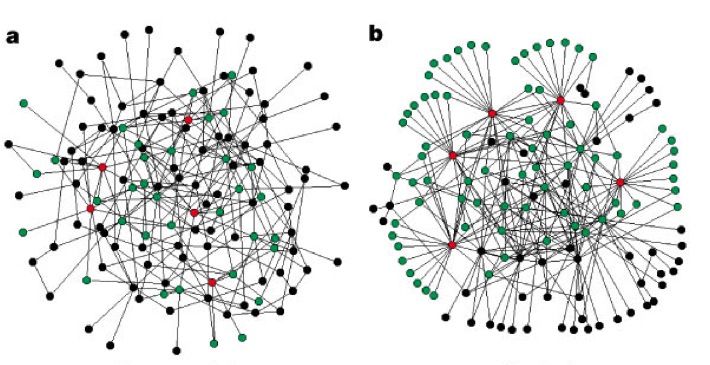 在过去的40多年里,科学家们一直想当然地认为现实中的网络都是随机的,随机图论就是专门为了研究随机网络而发展起来的一门数学学科,但无标度特性的发现打破了这种构想。本节第一幅图中,左侧的网络a就是随机网络,右侧的网络b就是无标度网络。