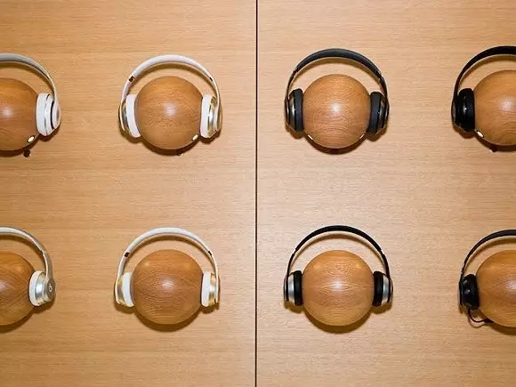 耳机被放置在一个个木球上
