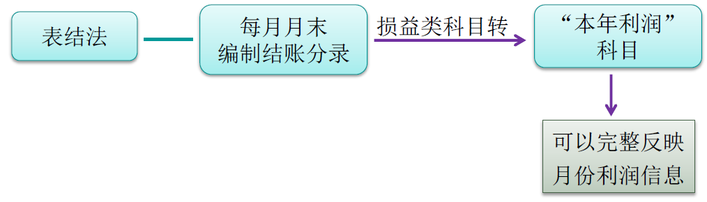 在表结法下,各损益类科目每月月末只需计算出本月发生额和月末累计余额,不需要编制会计分录将相应的余额结转到“本 年利润”科目。