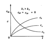 b. 浓度对选择性的影响(温度不变时) 当主反应级数大于副反应级数,即a1>a2,bl>b2时,升高浓度,使选择性增加,若要维持较高的cA、cB,则应选择平推流反应器、间歇反应器或多釜串联反应器。