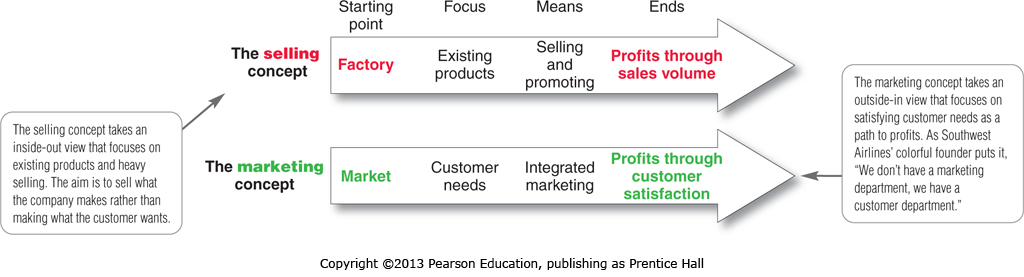 The selling concept takes an inside-out approach, whereas the marketing concept uses an outside-in perspective. (Figure below )