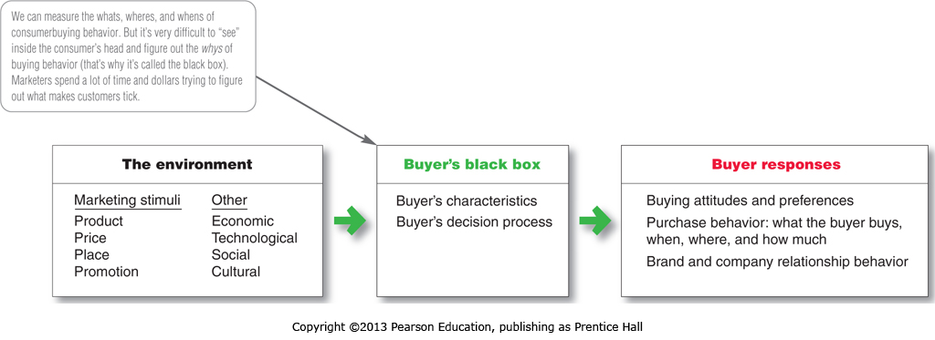 The marketer wants to understand how the stimuli are changed into responses inside the consumer’s black box, which has two parts.