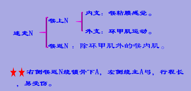 1.喉上神经(superior laryngeal nerve) 在舌骨大角高度分为内、外两支。外支为运动支,支配环甲肌。内支为感觉支,分布于声带以上区域黏膜。