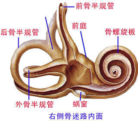 (2)前庭:位于耳蜗与骨半规管之间。后上部有3个骨半规管的5孔通入。外侧为鼓室内壁的一部分,有前庭窗和蜗窗,前庭窗由镫骨足板所封闭。(1)骨半规管:位于前庭的后上方,每侧有3个呈弓状弯曲的骨管,互成直角,分别称为外(水平)半规管、上(垂直)半规管和后(垂直)半规管。每个半规管的两端均开口于前庭,其一端膨大称壶腹,而上半规管内端与后半规管上端合成总脚,故3个半规管由5孔与前庭相通。