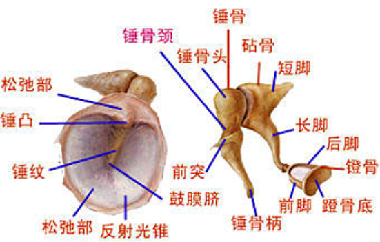 (2)鼓室内容物:有3块听骨,即锤骨、砧骨和镫骨,借韧带与关节相连构成听骨链。外侧以锤骨柄与鼓膜相接,镫骨足板借周围韧带连于前庭窗。有2条肌肉,即鼓膜张肌及镫骨肌。还有1根神经——鼓索神经。