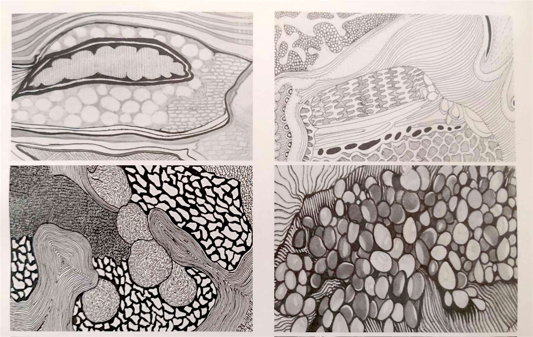 1.要求改变习惯视距,以微观的方式观察自然物象的剖面或表面,体会自然力形成的各种形态。从不同角度分析自然形态构成的多重性,分析形态间的组织关系。