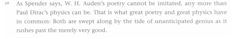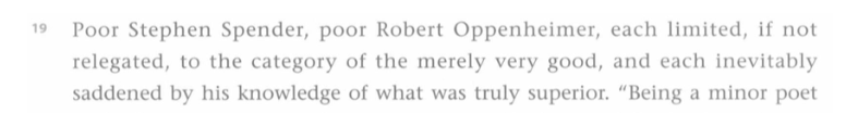 Oppenheimerand Spender belong to the merely very good category and Dirac and Auden to the truly superior category. To be more original and profound one has to be more focused. As the author says, Auden and Dirac focused like laser beams. This, according to the author, creates the difference between being great and being merely very good.