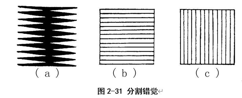 分割错觉 同一几何图形或同一尺寸的东西,由于采取不同的分割方法,就会使人感到它们的形状和尺寸都发生了不同的变化,这就是分割错觉。