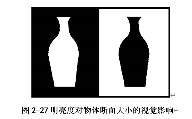 明度影响面积大小:图2-26中断面面积完全相等的两只花瓶,人们会感到白色的花瓶面积为大。这一现象的规律是:同面积物体,明度越高,则越显其大,因此欲显物体大些时,可采用明亮色,反之,则使用深暗色。