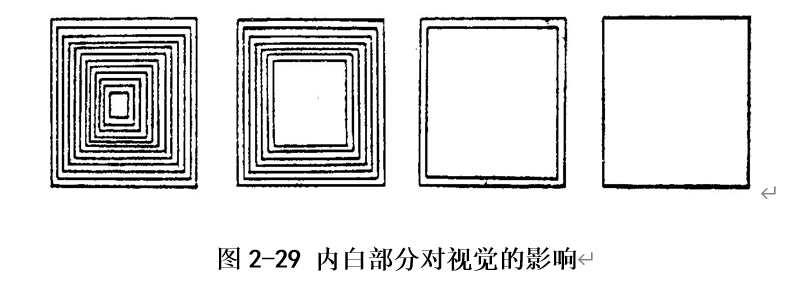 图2-28中,四个等大的正方形,由于每个正方形的内白部分大小不同,则它们的大小,感觉到明显不同。内白大的,感觉大;内白小的,其视觉小。