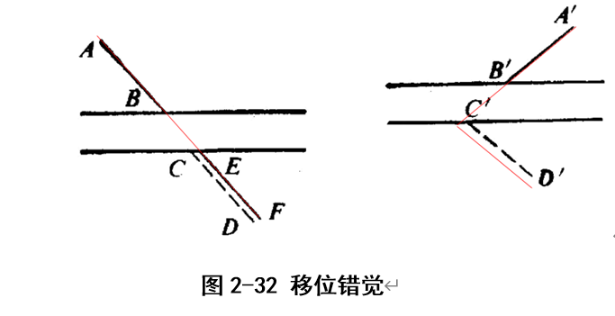 当一条斜线(或直线)被一定间距的平行线截成两条射线时,就会产生这两条射线似乎不在一条直线上的错觉,这种错觉称为移位错觉。