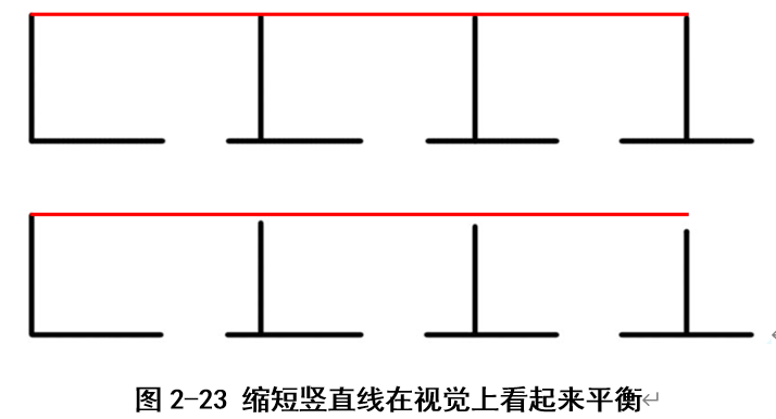 由于视觉有长短错觉,因此有时为了使人感到横、竖线相等,就需要进行矫正。矫正的方法是将竖线减短或将横线加长。例如,我国书法中遇到像“上”“下”这类横竖结构的字,就用“横长直短”的方法来处理。
