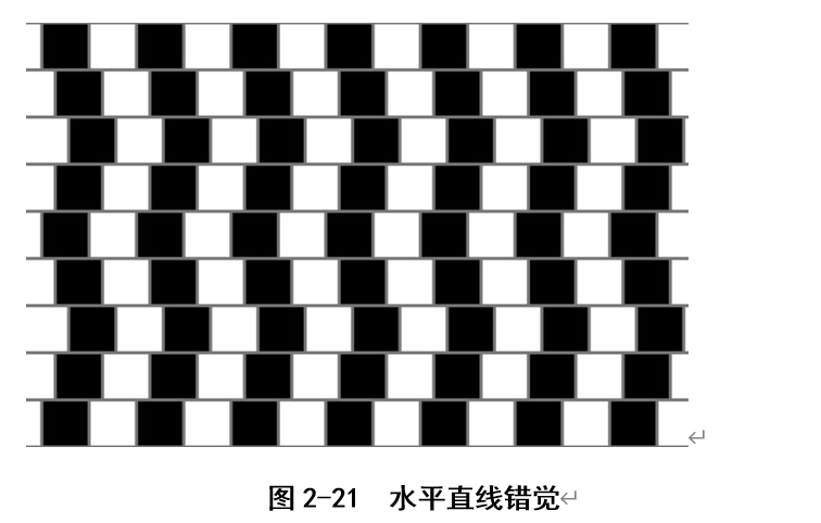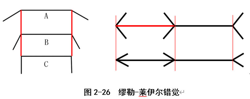 在图2-25中,是由缪勒-莱伊尔发现的一种几何错觉。两条本来相等的横直线,由于两端附加的箭头方向不同而显得长度不同。垂直水平错觉是由于眼睛作上下运动比作水平运动困难一些,人们看垂直线比看水平线费力,因而垂直线看起来长一些。同样,在缪勒一莱尔错觉中,由于箭头向外的线段引起距离较大的眼动,箭头向内的线段引起距离较小的眼动,因此前者看上去长一些。