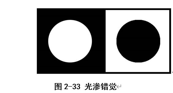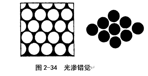 下页图2-32所示是两个大小相等的圆(黑的和白的),但看起来白得似乎比黑的要大一些。这是由于眼睛的球面像差作用所致,光亮物体在视网膜上所成的像的轮廓外有一圈光围着,这使物体在视网膜上所成物象的轮廓扩大了,看起来觉得比实物更大些,物像上那道镶边的光圈(凝视白圈稍久,便可发现白圈的边缘比中部更光亮些)好像是光从像中渗透出来似的,这种现象称为“光渗”。这种光渗引起的白大黑小的错觉则称为“光渗错觉”。