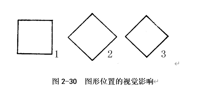 还有一种面积错觉很值得我们注意,如图2-29所示。图中形1和形2是相同的正方形,只是2旋转了45度,人们就感到2比1大。这是由于我们在观察2时,它的对角线特别引人注目,而正方形的对角线是边长的倍,形2与形1放在一起,横向竖向都比正方形边长长一段,因此,给人的感觉必然是形2比形1大了。如将形2缩到形3那样,这才会使人感到它与形1面积相等。