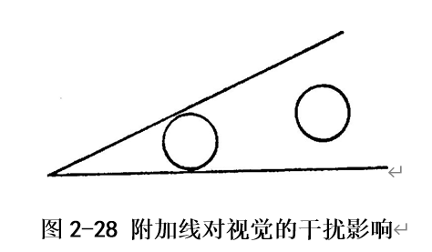 附加线形干扰影响面积大小:图2-27中,在同一个角内靠近角顶端的那个圆显然要比离角顶端远的那个圆面积大,这是附加线对视觉的干扰影响。