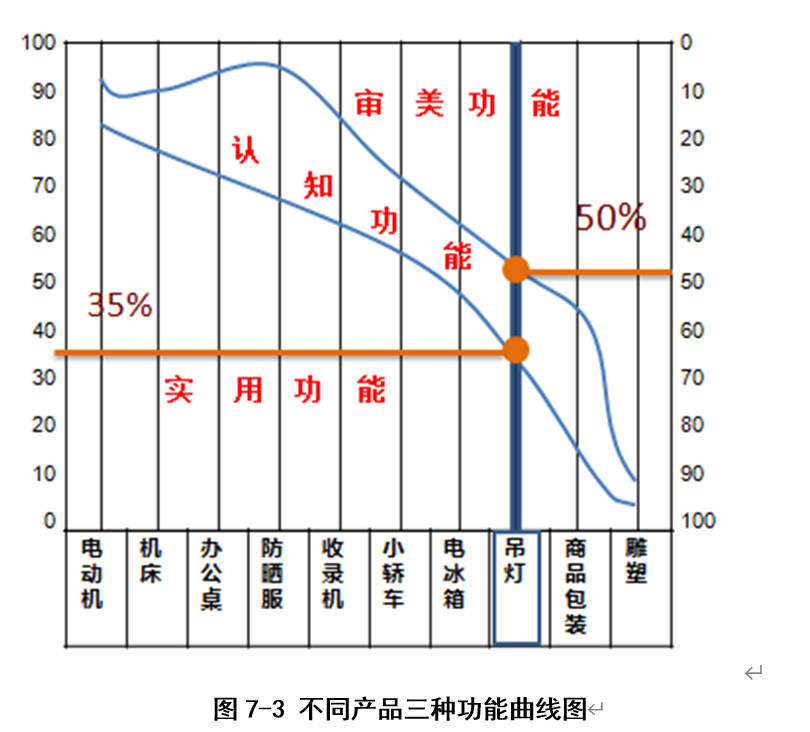 | 这几项功能中实用功能是基础,但并不一定是产品的主要功能,有的产品的主要功能是认知功能和审美功能,这在设计中是需要注意的。图示是不同产品的三种功能的比例关系。可知,电机以实用功能为主,而广告以认知和审美功能为主,雕塑以审美为主。