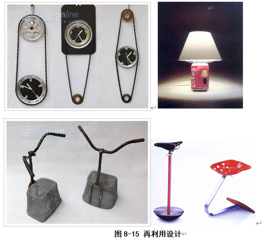 2.“Reuse”是“回收”的意思,即本来已脱离产品消费轨道的零部件返回到合适的结构中,继续让其发挥作用;也可以指由于更换影响整体性能的零部件而使整个产品返回到使用过程中。这一原则可称之为“再利用设计原则”