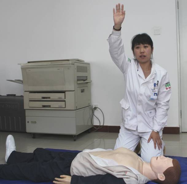 呼叫:快来人啊,有人晕倒了!表明身份:我是救护员!吩咐他人:快打急救电话999 、 120!”并求得帮助请带AED