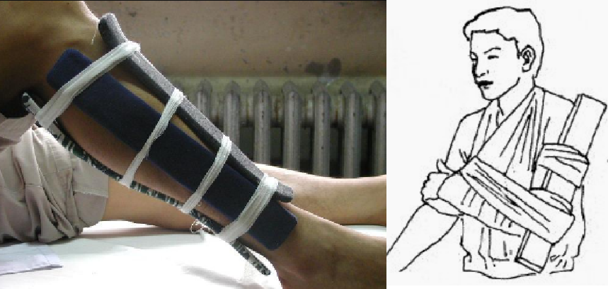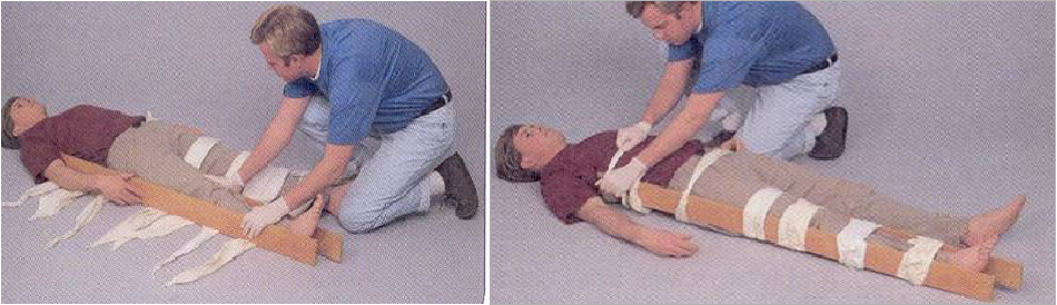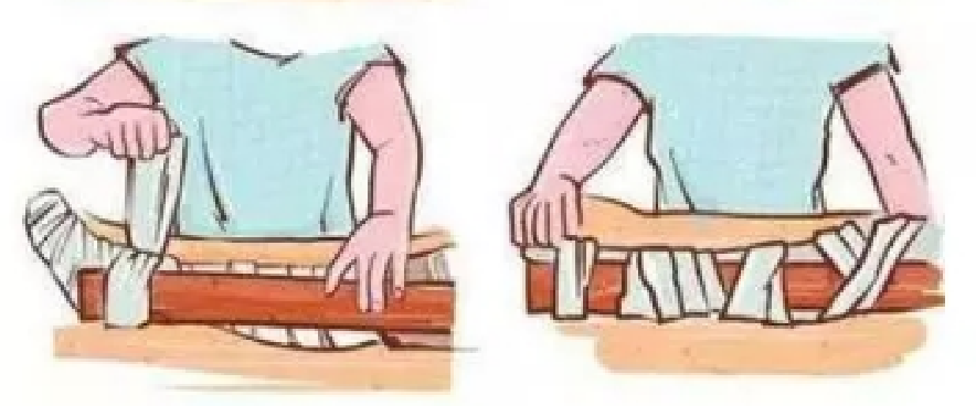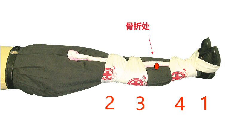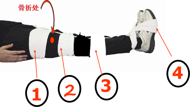 ④如只有一块木板则放于伤腿外侧,从腋下到外踝。