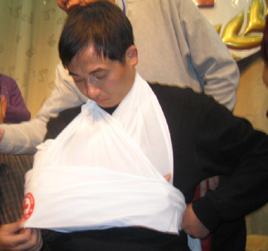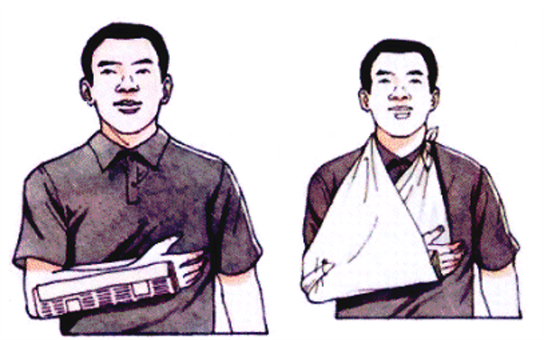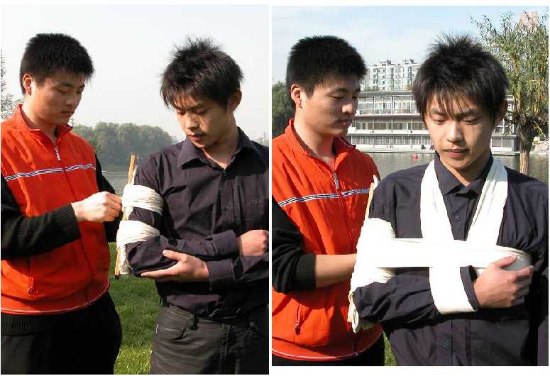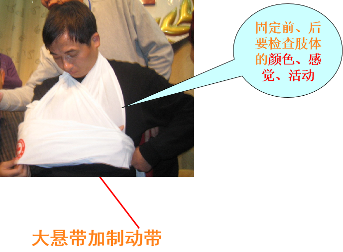 1).用夹板固定:取两块夹板,其长度超过肘关节至腕关节的长度,分别置于前臂内、外侧,用绷带或带状三角巾在两端固定,再用三角巾将前臂悬吊于胸前