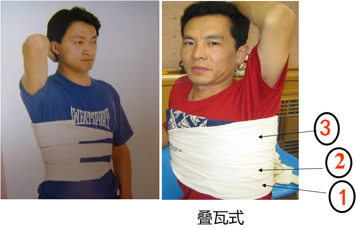 ①两块木板,一块木板放于上臂外侧,从肘部到肩部,另一块放于上臂内侧,从肘部到腋下。