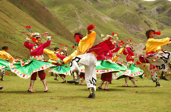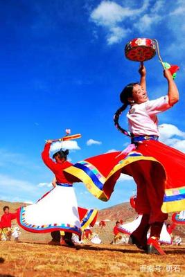 铃鼓是热巴的重要组成部分,分九种鼓点,根据鼓点节奏的不同来表演舞蹈。在表演中,男持铜铃,女执手鼓(因而热巴舞又名"铃鼓舞"),绕圈走动,翩翩起舞。铃鼓声节节奏鲜明,随着曲调和情感的变化或高或低,或急或缓。节奏徐缓,铃鼓间响,清声幽远,似深箐山溪,原野牧铃铛;节奏急促,钹鼓齐鸣,轰轰烈烈,像急流奔涌,高山雪崩。进入高潮,舞蹈动作址分强烈,男子仿佛雄鹰一般单腿跨转,腾跃飞旋,女子一手拿弓鼓槌,高举头顶,转翻身子欢舞,犹如孔雀开屏。舞蹈动作选用弦子、锅庄舞步的同时,吸收了杂技表演的一些技巧动作,比较精彩的有"躺身平转"、"躺身小蹦子"、"前后甩腰"、"跨腿原地转"、"躺身大蹦子"等。接下来,请跟随我一起欣赏热巴舞: