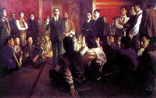 1905年7月,孙中山、黄兴、陈天华等70余人在东京集会,决定成立中国同盟会,作为全国的革命领导中心。兴中会、华兴会、光复会以及其他小团体的成员陆续加入。8月中旬,孙中山在留学生欢迎会上发表了《中国应建设共和国》的演说。同月20日,同盟会召开成立大会,孙中山被推为总理,黄兴被推为执行部庶务,会议确定了驱除鞑虏,恢复中华,创立民国,平均地权的16字纲领。11月,同盟会机关报《民报》出版,孙中山在发刊词中首次提出以民族、民权、民生为核心内容的三民主义。戊戌维新运动失败后,康有为、梁启超流亡海外,仍以保皇相号召。《民报》创办后即同梁启超主编的《新民丛报》展开论战。辩论结果,革命派占据上风,改良派的政治影响大为衰落。