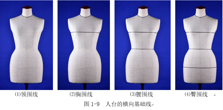⑵胸围线:正面观察人台右侧BP点,眼睛与该点持水平状态。预留30-35cm长度的胶带,用大头针将胶带固定在BP点,平稳转动人台将胶带水平粘贴至人台左侧,再从固定的BP点向相反方向转动人台,并水平粘贴所预留的胶带至人台左侧,处理好胶带接头。人台的两胸高点间与肩胛骨间会出现凹面,需要压实胶带。将人台放置两米远处由他人协助转动人台,眼睛仍需要与胸围线保持水平状态观察胶带位置进行微调,将胸围线调整至水平。