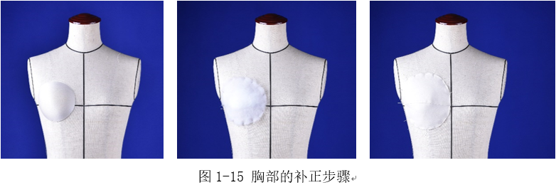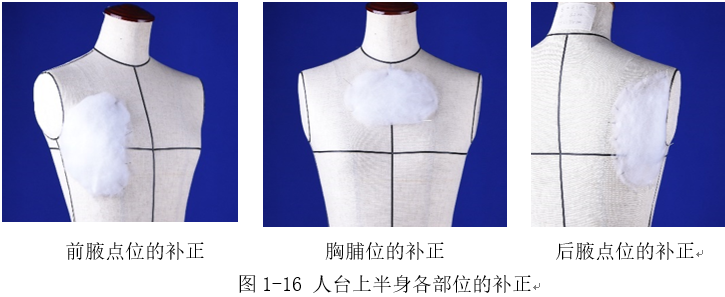 人体体型呈现一个复杂的曲面,而且存在明显的个体差异性。批量生产的人台在细节处理中很难达到设计师的要求。特别是在人台的上半身造型处理时,人体的厚度需要通过对人台的前腋点位、后腋点位进行补正调整。对于胸骨向前隆起等特殊体型则需要对胸脯位进行填充补正。材料可以使用填充棉或棉花进行层层贴加。