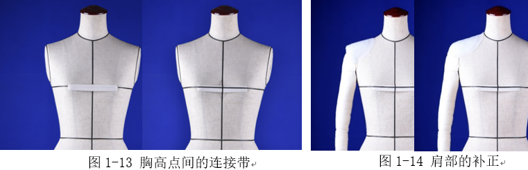 初学者在进行立体裁剪操作中,面料很容易随着两胸高点间的体型特征塑造出的凹陷造型,从而增加前中心线的长度,影响作品的整体效果。所以根据不同的设计,需要在两胸高点间固定一条连接带(图1-13),通常适用于成衣类服装。凸显胸部造型的服饰或礼服类服饰较少使用。