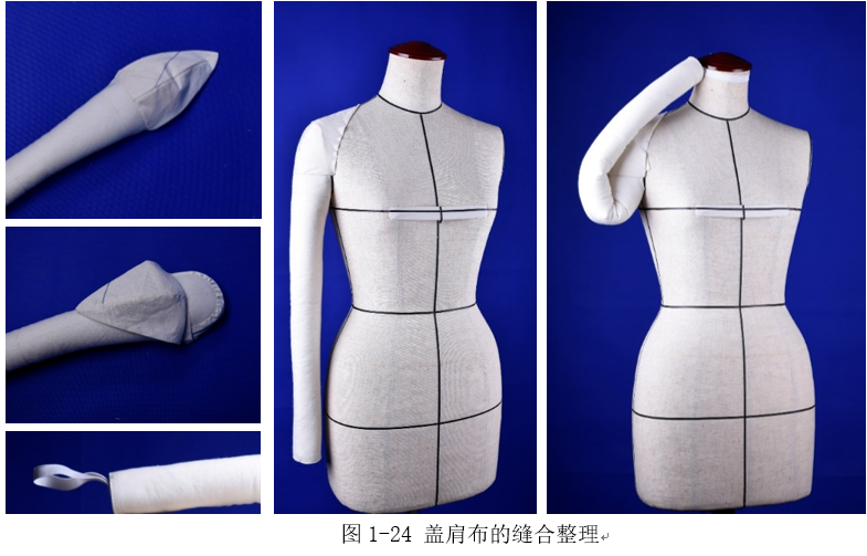 袖山条的使用可以将手臂模型固定在人台上,而盖肩布不仅可以起到加固作用,同时能使人台和手臂模型的连接更加顺畅自然。按照结构图裁剪四片盖肩布裁片,其中两片为一组,缝合单边,成为两大片裁片。再将两大片裁片正面相对,沿结构线缝合两侧后,将正面翻出。熨烫整理盖肩布片。最后将盖肩布固定到手臂模型上。