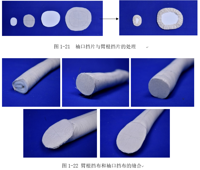 用纸板按照臂根挡片和袖口挡片的净尺寸进行裁剪备用。为了使手臂模型和人台臂根处有更好的贴合度,所使用的纸板需要有一定的厚度和硬度。将纸板对准臂根挡片和袖口挡片的结构线,在缝份处进行抽缩处理,将纸板固定在臂根挡片和袖口挡片内(图1-21)。整理手臂模型的臂根位与袖口位置,可在两端的缝份处进行抽缩处理。将其与臂根挡片和袖口挡片的对位点对准,用大头针固定,并进行缝合。