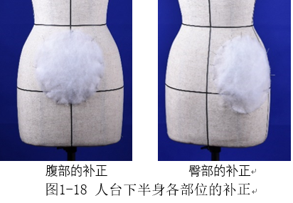 人台下半身需要补正的位置多在腹部和臀部(图1-18)。针对不同造型需要进行塑形修整。材料可以使用棉花、填充棉等填料,或臀垫等垫料。