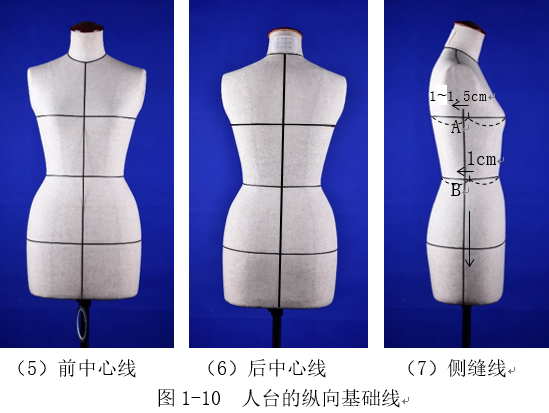 ⑺侧缝线:测量人台胸围的右半身尺寸,右侧面胸围线上取厚度的1/2点,向后移1~1.5cm处做记号(A点);在右侧面腰围线上取厚度的1/2点,并向后移动1cm标记B点;用胶带连接A、B两点。正面观察人台右侧面,眼睛与人台腰部持平,胶带从B点向下垂直粘贴。完成侧缝线。