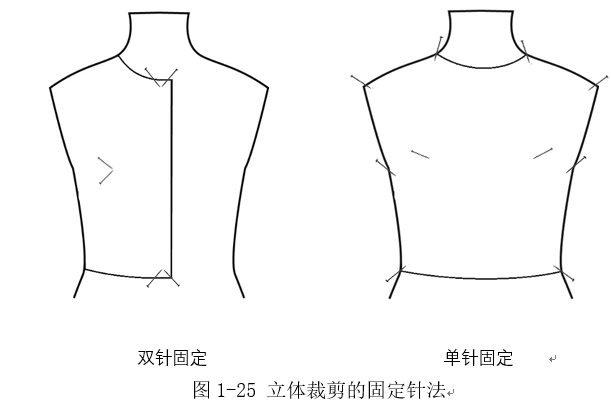 固定针法主要功能是将坯布固定在人台的特定位置,使其稳定牢固,便于造型的完成。在使用固定针法时,需要注意切不可将大头针全部插入人台内,不恰当的入针方法既会影响操作效率,同时,针头的压力也可能会造成坯布局部的凹陷,影响整体造型效果。如图1-26所示,固定针法分为双针固定与单针固定。