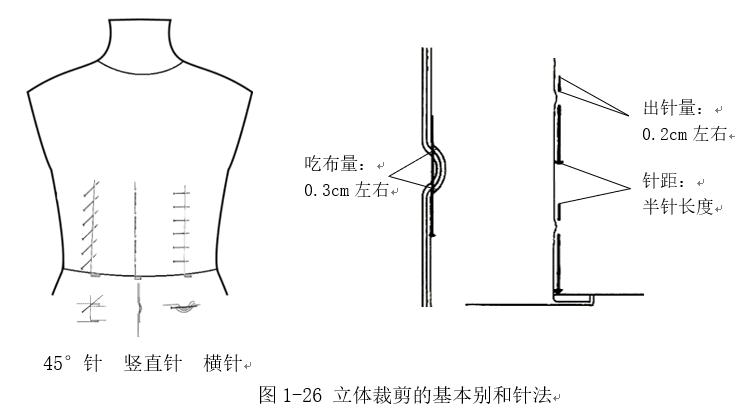 以图1-26中的左图为例,图中出现45度针、竖直针和横针三种不同角度的别和针法。在操作中,并未强制规定用针的角度,通常是根据具体的使用部位与造型、以及个人的用针习惯而定。只要保证所用针的入针角度、吃布量、出针量和针距保持一致即可。