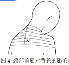 背长是从人体的后颈点至腰线的长度。图4为人体颈部前屈时背部皮肤的伸展状态,A点向下的皮肤为未见伸长,A点以上的皮肤随着颈部前屈的幅度加大而被拉伸。因此应注意在进行背长的测量时,被测者需保持正常站立姿势,即头部的耳、眼保持水平,后脚跟并拢,手臂自然下垂的自然立位姿势。不正确的测量习惯会影响后颈点的确定与背长尺寸的准确性。
