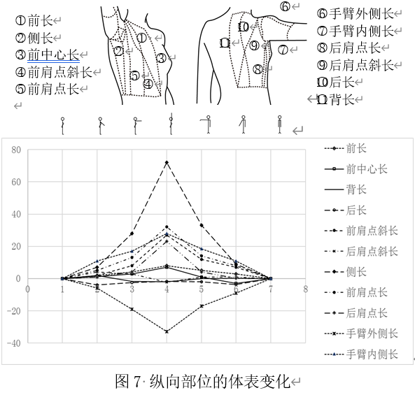 实验中上半身的纵向部位选取了人体的前长、前中心长、背长、后长、前肩点斜长、后肩点斜长、侧长、前肩点长、后肩点长、手臂外侧长、手臂内侧长等11个测量位。如图7所示,随着手臂上扬的角度增加,多数测量位的尺寸均发生不同程度的增加,其中侧长在手臂上举时尺寸增加幅度达到70%,其次为前肩点长、手臂内侧长、前肩点斜长、后肩点长、前长、前中心长等。有4个测量位的尺寸少于人体直立状态时的尺寸,其中以手臂外侧长在人体手臂上举状态时最为明显,尺寸收缩率达到33%,背长、后长和后肩点斜长的缩小率并不明显。从整体尺寸的变化趋势来看,以人体呈现直立状态时的各部位尺寸为基准,手臂上举时尺寸变化幅度最大,各部位体表尺寸与手臂上扬角度成正比变化趋势。在进行上半身服装造型时,需要考虑图7中,伸长率及收缩率变化较大的部位,进行适当的长度处理。避免人体运动造成腋窝位和肩部出现多余的堆积、或由于尺寸不足而影响着装的舒适度。